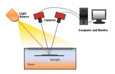 Digital Image Correlation (DIC) is a non-contact, full-field optical technique for measuring both in-plane and out-of-plane displacements of an object surface. A high contrast, random speckle pattern is applied to the surface of interest. Two cameras are mounted above the oven, viewing the sample from different angles.