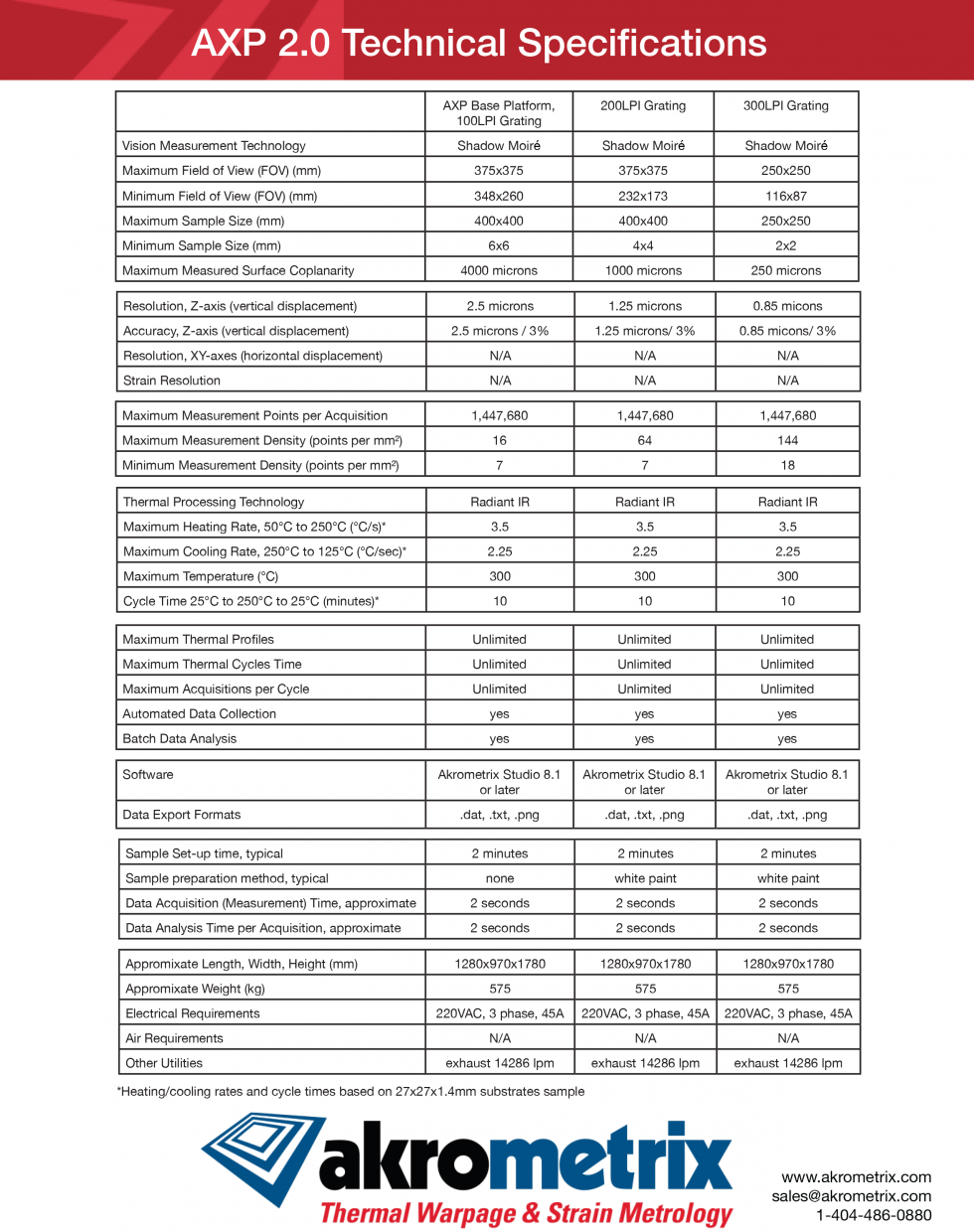 The TherMoiré® AXP 2.0 is a modular metrology solution that utilizes the Shadow Moiré measurement technique, combined with automated phase-stepping, to characterize out-of-plane displacement for samples up to 400 mm x 400 mm. With time-temperature profiling capability, the TherMoiré® AXP 2.0 captures a complete history of a sample’s behavior during a user-defined thermal profile.